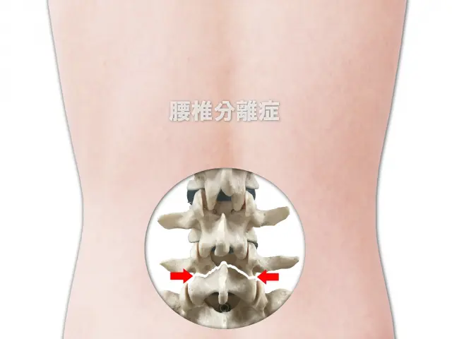 腰椎に繰り返しストレス(負荷)がかかることで起こる疲労骨折です。痛みは突然来るのが特徴で、シュートなどの練習時や着地などで「痛!」というような痛みが特徴です。