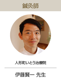 伊藤賢一先生は、学生時代より共に学んできた仲間です。当時から頭一つ出た存在で私も色々と教えて頂きました。プライベートではマラソンも一緒に走る仲間です。東洋医学と西洋医学の両方の知識とスポーツ経験を活かし、腰痛や肩こり、自律神経の不調まで幅広い症状に対応してくれます。「なんとなく体調がおかしい」という小さな悩みでも親身に相談に乗ってくれると思いますので人形町・水天宮周辺の方は是非、伊藤先生の治療を体験してみてください。きっと健康をサポートしてくれます。推薦文ありがとうございました。これからも高みを目指し精進していきたいと思います。